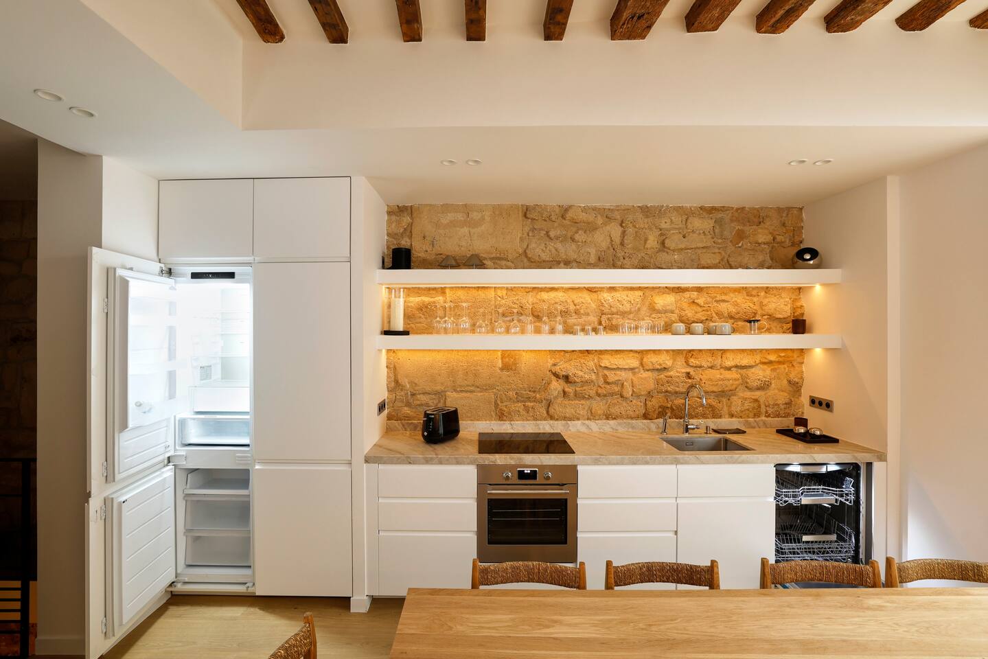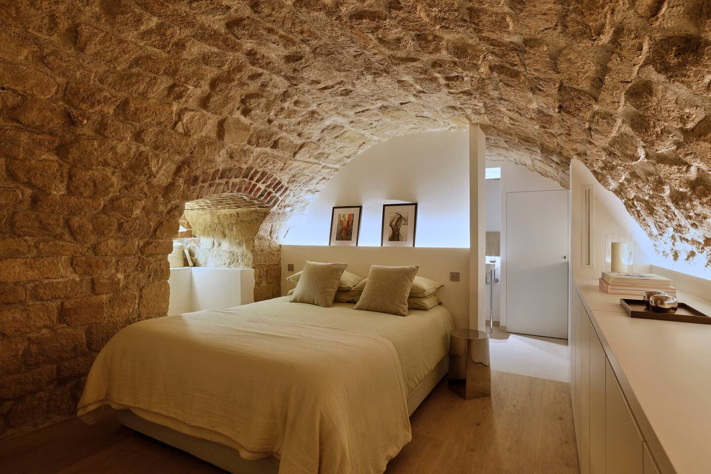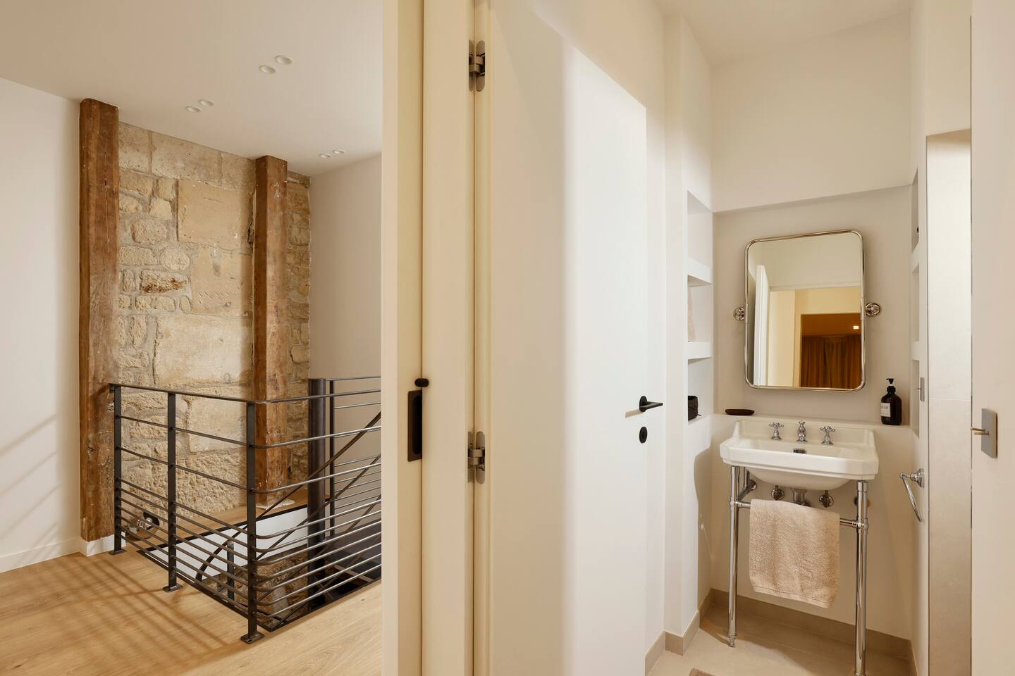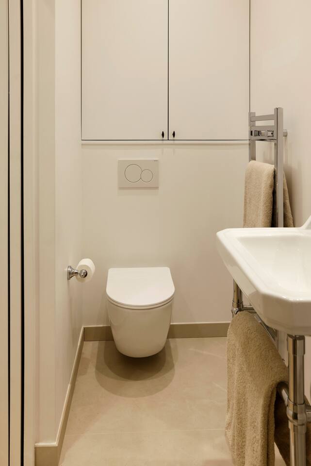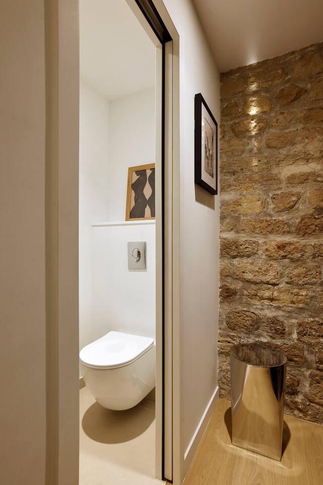 The 1500 sqft apartment is located on the ground floor of a typical Marais building. Designed and tastefully decorated by a renowned interior architect, the apartment features adjustable lighting and individual temperature control in each room, ensuring year-round comfort thanks to underfloor heating and air conditioning. With only one street-facing window and a window onto the courtyard, the apartment offers a peaceful, cocoon-like atmosphere. The generous ceiling height, glass roof above the living room, well-designed lighting and efficient ventilation ensure the space feels open, comfortable and never enclosed. The dining area includes a table that comfortably seats up to 10 guests. The fully equipped kitchen offers a dishwasher, oven and microwave, induction cooktop, kettle, Nespresso coffee machine with capsules, toaster, as well as a washing machine and a dryer. An ironing board, iron and drying rack are also provided. The living room sofa bed converts into a comfortable 180x200 cm sleeping area with a 12 cm thick mattress. Bed linen and duvets for this bed are stored in the wardrobe of one of the bedrooms. The first air-conditioned bedroom features a hotel-quality queen-size bed (160x200 cm), a spacious wardrobe and a dedicated workspace with a desk. The en-suite bathroom includes a shower, washbasin, toilet and hairdryer. The second air-conditioned bedroom also offers a hotel-quality queen-size bed (160x200 cm), a wardrobe, and a private bathroom with shower, washbasin and toilet. On the lower level, a small landing leads to a third separate toilet and the two remaining bedrooms. The third bedroom, a suite, features a hotel-quality queen-size bed (160x200 cm), a large wardrobe and a stunning bathroom with a spacious walk-in shower and vanity unit. The fourth bedroom offers a hotel-quality queen-size bed (160x200 cm), a large wardrobe and a private bathroom with shower and vanity unit. Bath amenities (shower gel and shampoo) as well as soft towels are provided in all bathrooms. Ultra-fast high-speed internet via fiber optic connection is available throughout the apartment, with two Wi-Fi repeaters.
