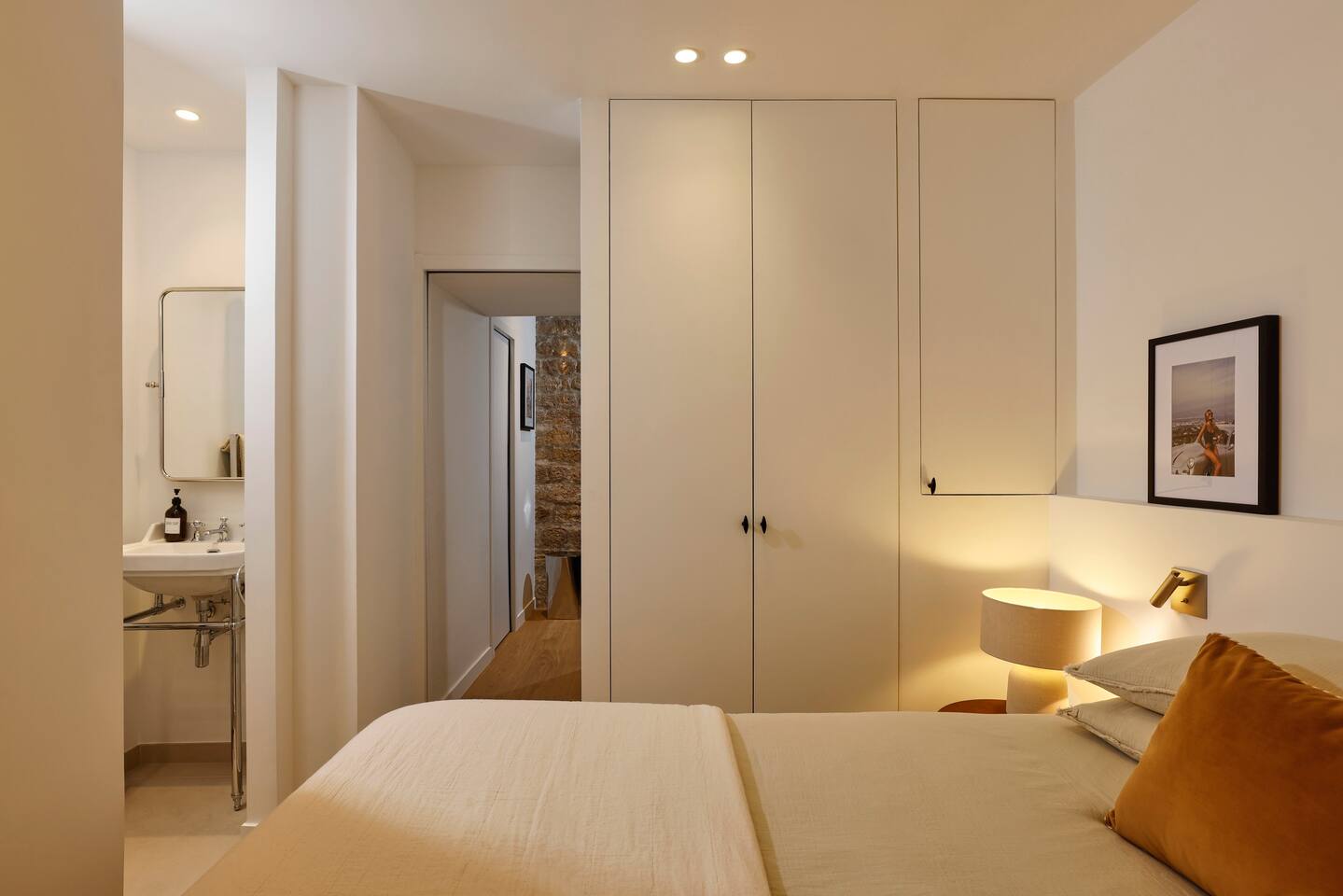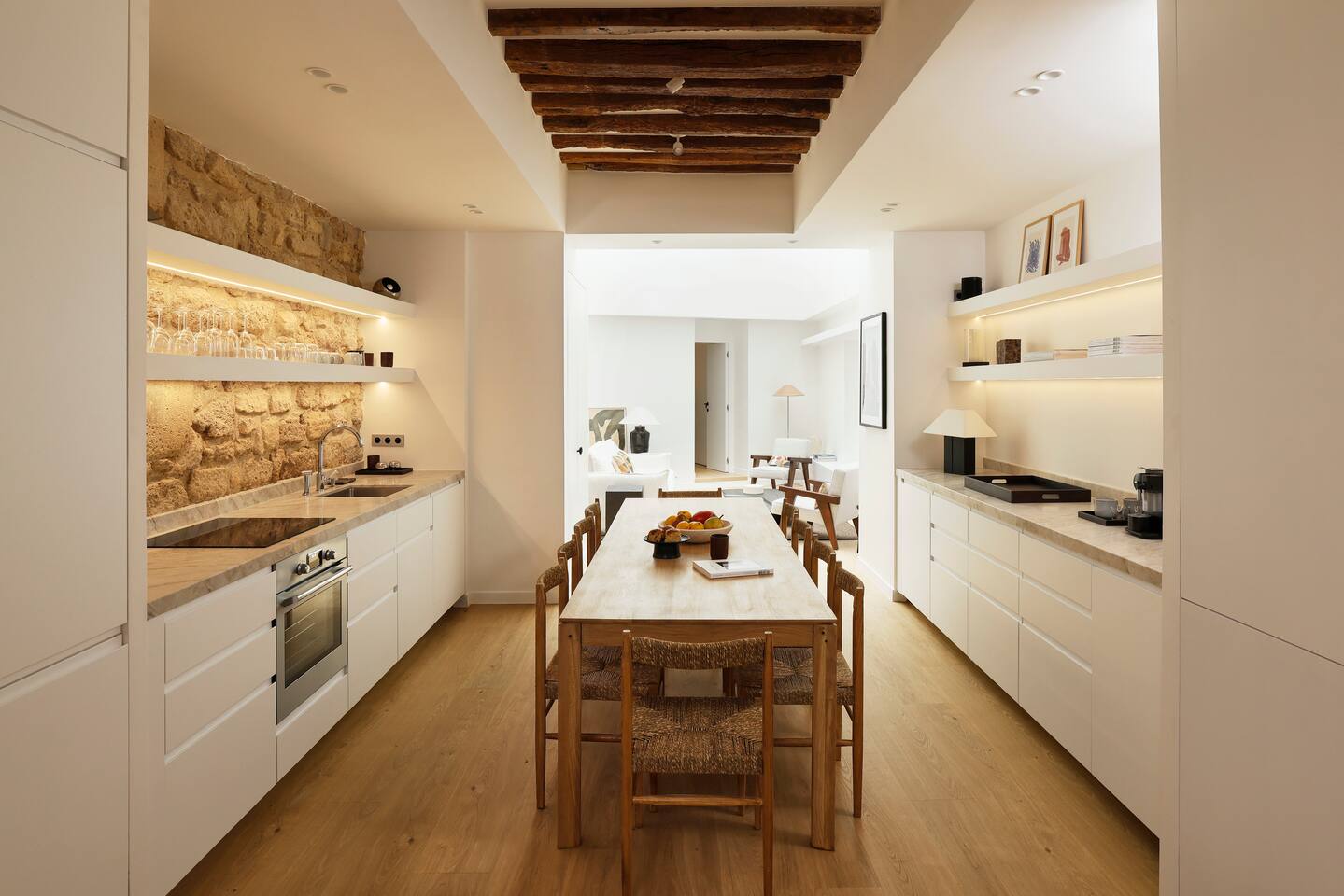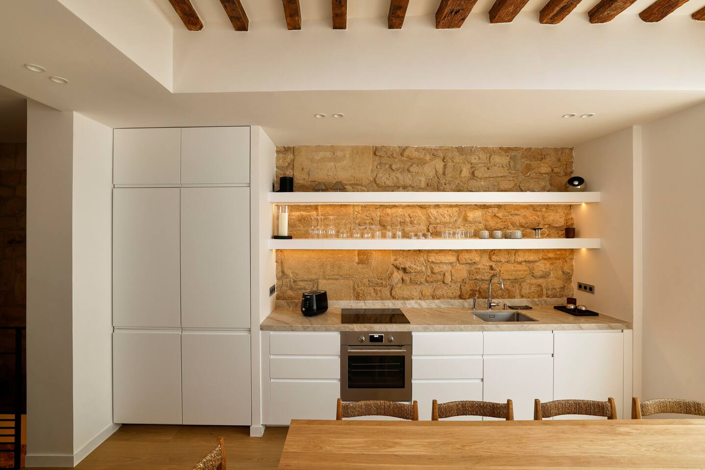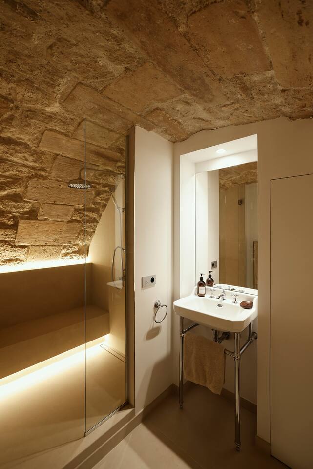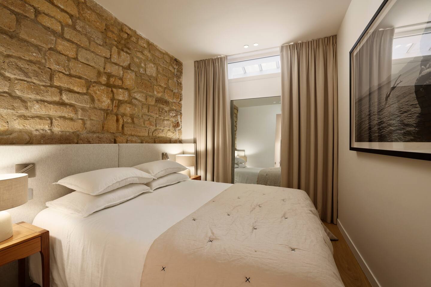 The 1500 sqft apartment is located on the ground floor of a typical Marais building. Designed and tastefully decorated by a renowned interior architect, the apartment features adjustable lighting and individual temperature control in each room, ensuring year-round comfort thanks to underfloor heating and air conditioning. With only one street-facing window and a window onto the courtyard, the apartment offers a peaceful, cocoon-like atmosphere. The generous ceiling height, glass roof above the living room, well-designed lighting and efficient ventilation ensure the space feels open, comfortable and never enclosed. The dining area includes a table that comfortably seats up to 10 guests. The fully equipped kitchen offers a dishwasher, oven and microwave, induction cooktop, kettle, Nespresso coffee machine with capsules, toaster, as well as a washing machine and a dryer. An ironing board, iron and drying rack are also provided. The living room sofa bed converts into a comfortable 180x200 cm sleeping area with a 12 cm thick mattress. Bed linen and duvets for this bed are stored in the wardrobe of one of the bedrooms. The first air-conditioned bedroom features a hotel-quality queen-size bed (160x200 cm), a spacious wardrobe and a dedicated workspace with a desk. The en-suite bathroom includes a shower, washbasin, toilet and hairdryer. The second air-conditioned bedroom also offers a hotel-quality queen-size bed (160x200 cm), a wardrobe, and a private bathroom with shower, washbasin and toilet. On the lower level, a small landing leads to a third separate toilet and the two remaining bedrooms. The third bedroom, a suite, features a hotel-quality queen-size bed (160x200 cm), a large wardrobe and a stunning bathroom with a spacious walk-in shower and vanity unit. The fourth bedroom offers a hotel-quality queen-size bed (160x200 cm), a large wardrobe and a private bathroom with shower and vanity unit. Bath amenities (shower gel and shampoo) as well as soft towels are provided in all bathrooms. Ultra-fast high-speed internet via fiber optic connection is available throughout the apartment, with two Wi-Fi repeaters.