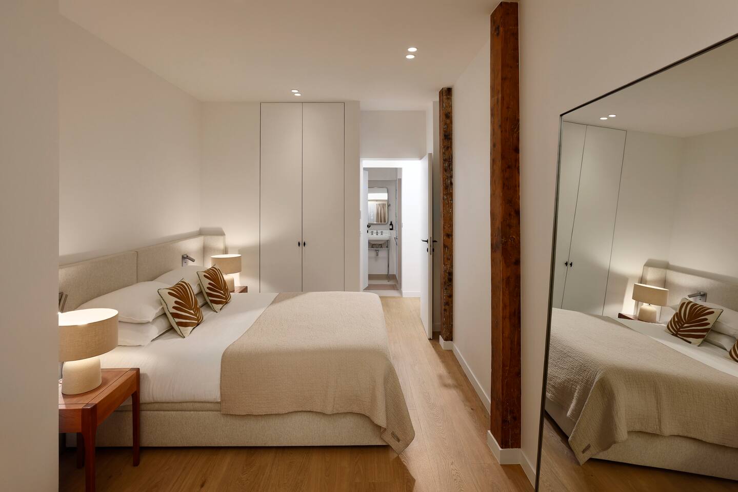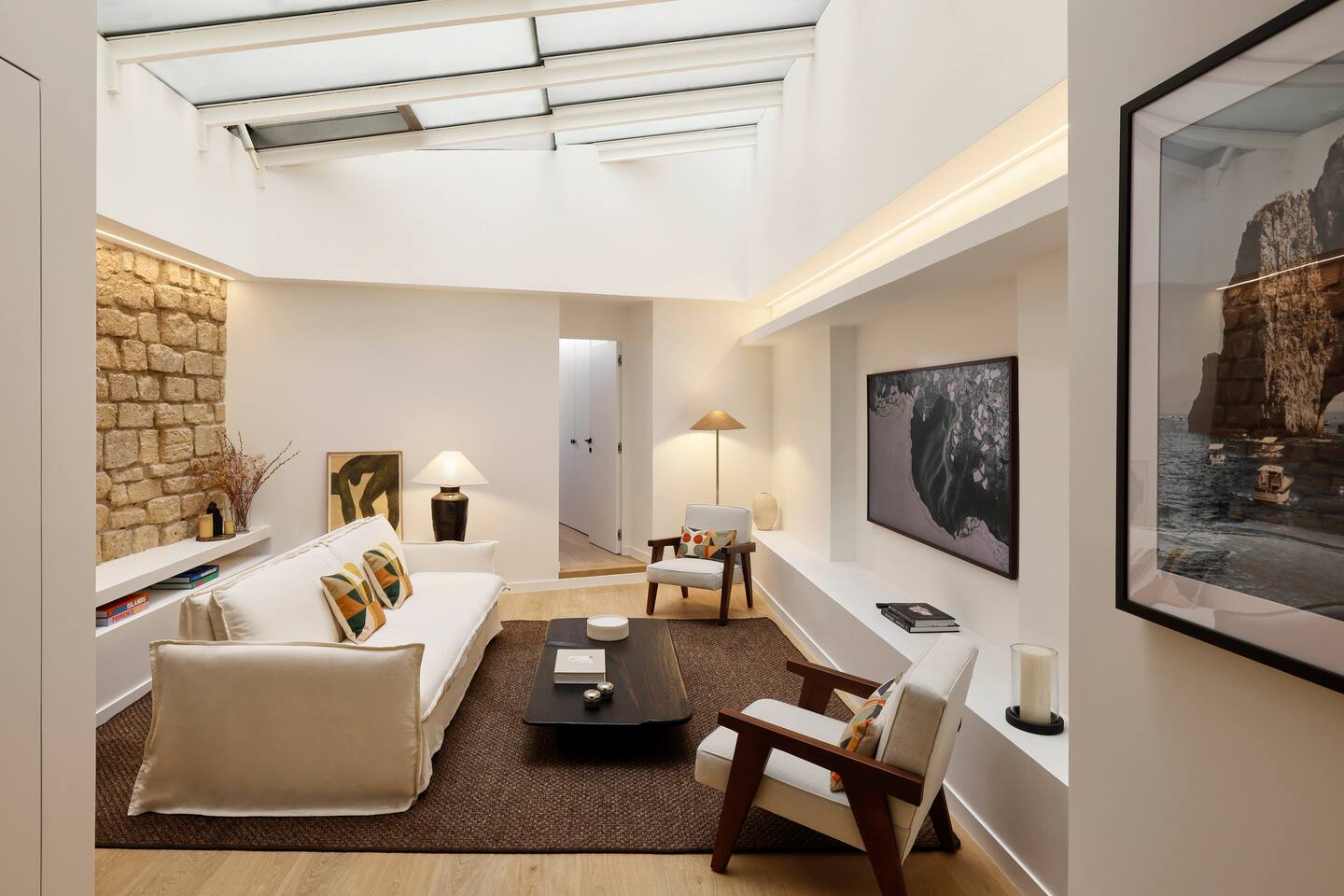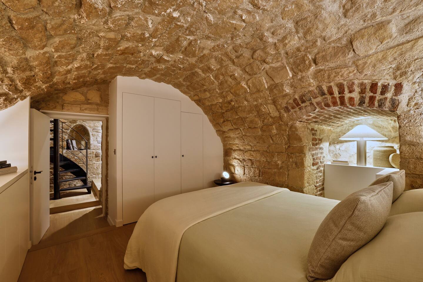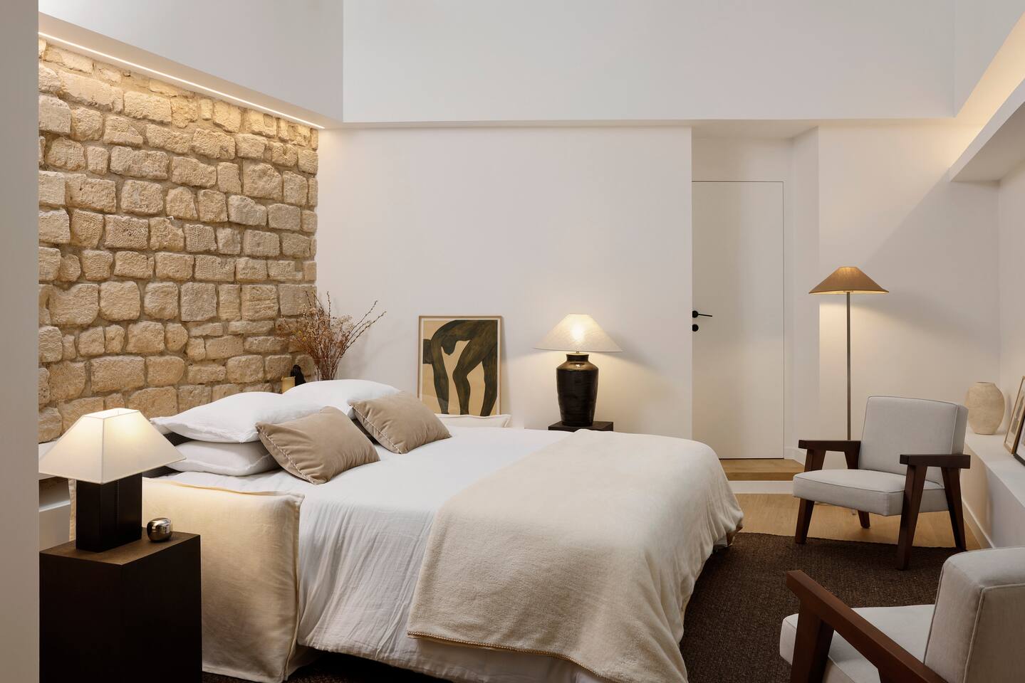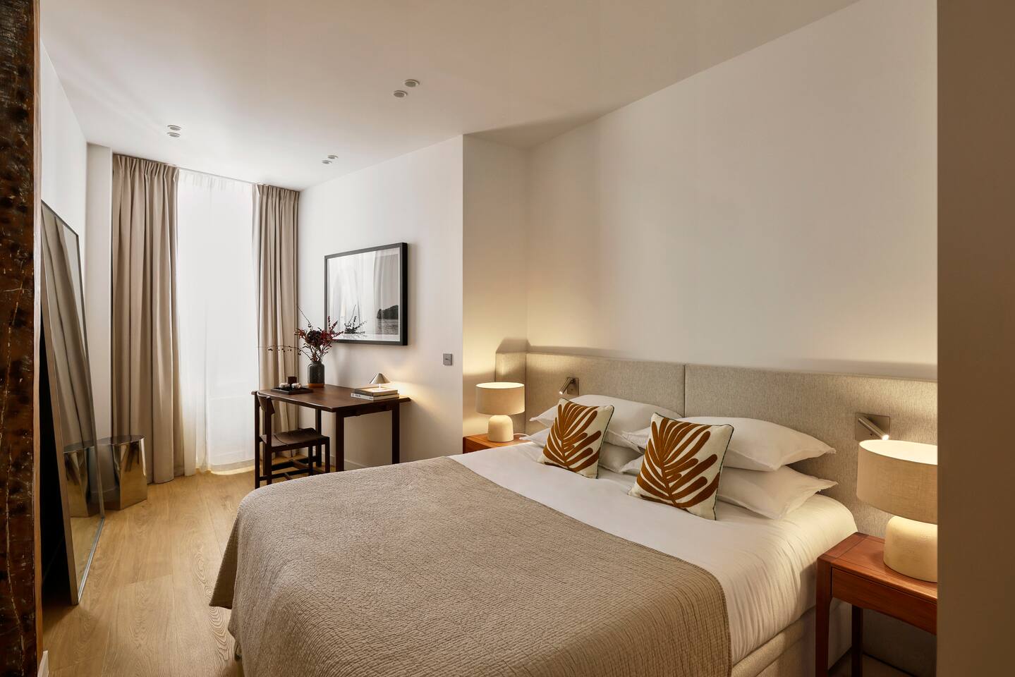 The 1500 sqft apartment is located on the ground floor of a typical Marais building. Designed and tastefully decorated by a renowned interior architect, the apartment features adjustable lighting and individual temperature control in each room, ensuring year-round comfort thanks to underfloor heating and air conditioning. With only one street-facing window and a window onto the courtyard, the apartment offers a peaceful, cocoon-like atmosphere. The generous ceiling height, glass roof above the living room, well-designed lighting and efficient ventilation ensure the space feels open, comfortable and never enclosed. The dining area includes a table that comfortably seats up to 10 guests. The fully equipped kitchen offers a dishwasher, oven and microwave, induction cooktop, kettle, Nespresso coffee machine with capsules, toaster, as well as a washing machine and a dryer. An ironing board, iron and drying rack are also provided. The living room sofa bed converts into a comfortable 180x200 cm sleeping area with a 12 cm thick mattress. Bed linen and duvets for this bed are stored in the wardrobe of one of the bedrooms. The first air-conditioned bedroom features a hotel-quality queen-size bed (160x200 cm), a spacious wardrobe and a dedicated workspace with a desk. The en-suite bathroom includes a shower, washbasin, toilet and hairdryer. The second air-conditioned bedroom also offers a hotel-quality queen-size bed (160x200 cm), a wardrobe, and a private bathroom with shower, washbasin and toilet. On the lower level, a small landing leads to a third separate toilet and the two remaining bedrooms. The third bedroom, a suite, features a hotel-quality queen-size bed (160x200 cm), a large wardrobe and a stunning bathroom with a spacious walk-in shower and vanity unit. The fourth bedroom offers a hotel-quality queen-size bed (160x200 cm), a large wardrobe and a private bathroom with shower and vanity unit. Bath amenities (shower gel and shampoo) as well as soft towels are provided in all bathrooms. Ultra-fast high-speed internet via fiber optic connection is available throughout the apartment, with two Wi-Fi repeaters.