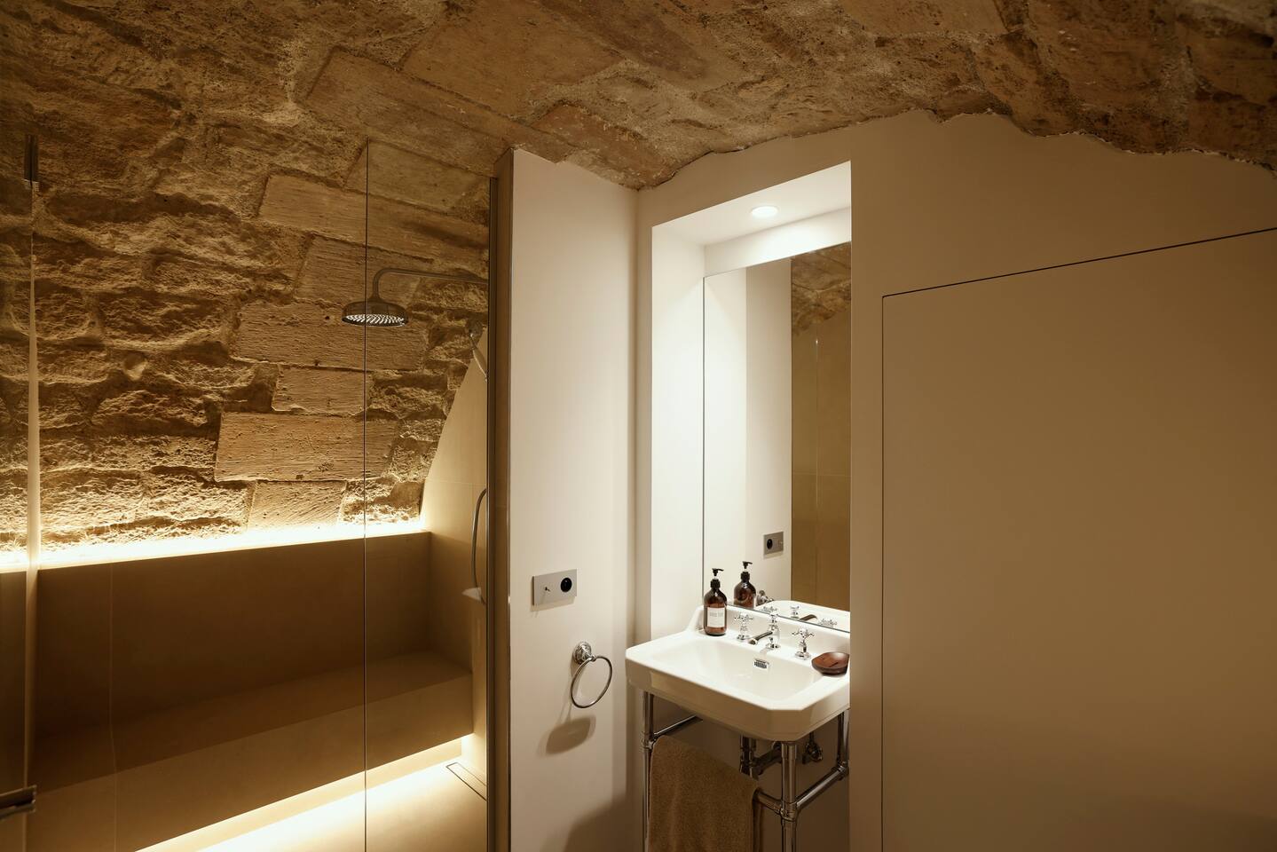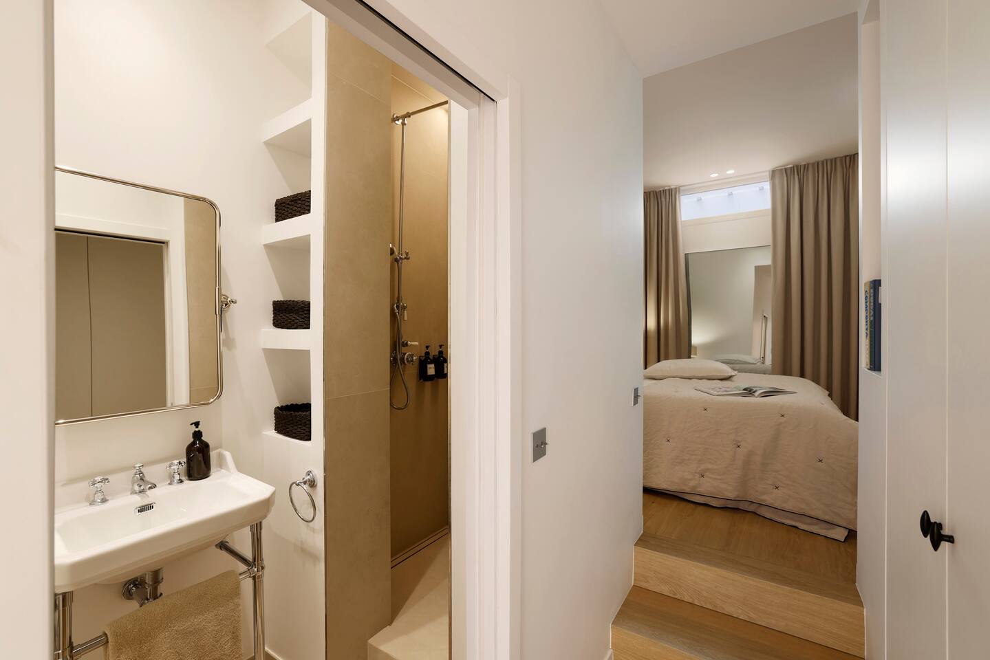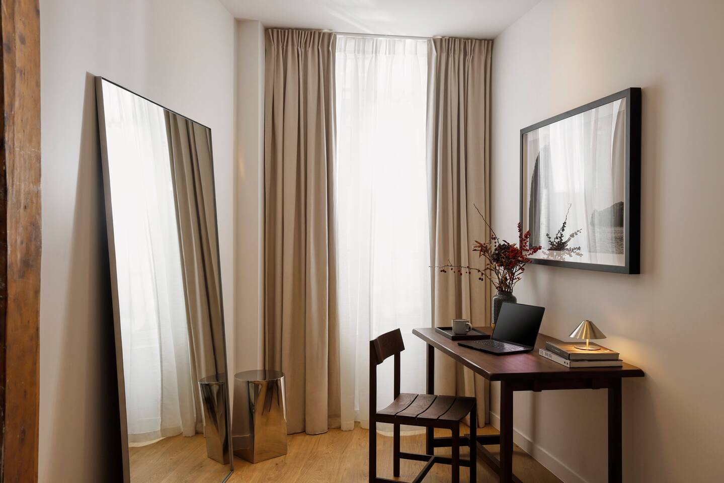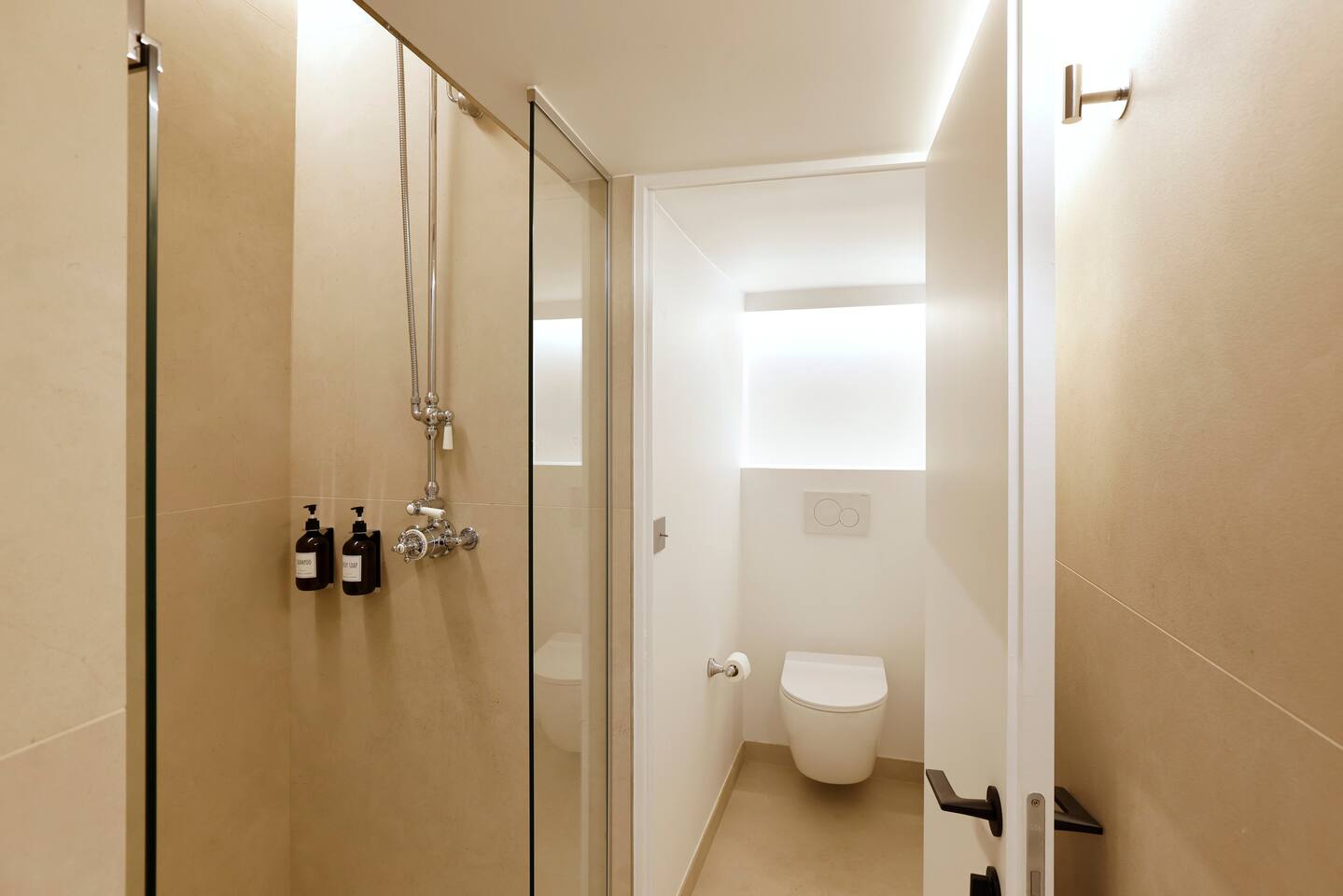 The 1500 sqft apartment is located on the ground floor of a typical Marais building. Designed and tastefully decorated by a renowned interior architect, the apartment features adjustable lighting and individual temperature control in each room, ensuring year-round comfort thanks to underfloor heating and air conditioning. With only one street-facing window and a window onto the courtyard, the apartment offers a peaceful, cocoon-like atmosphere. The generous ceiling height, glass roof above the living room, well-designed lighting and efficient ventilation ensure the space feels open, comfortable and never enclosed. The dining area includes a table that comfortably seats up to 10 guests. The fully equipped kitchen offers a dishwasher, oven and microwave, induction cooktop, kettle, Nespresso coffee machine with capsules, toaster, as well as a washing machine and a dryer. An ironing board, iron and drying rack are also provided. The living room sofa bed converts into a comfortable 180x200 cm sleeping area with a 12 cm thick mattress. Bed linen and duvets for this bed are stored in the wardrobe of one of the bedrooms. The first air-conditioned bedroom features a hotel-quality queen-size bed (160x200 cm), a spacious wardrobe and a dedicated workspace with a desk. The en-suite bathroom includes a shower, washbasin, toilet and hairdryer. The second air-conditioned bedroom also offers a hotel-quality queen-size bed (160x200 cm), a wardrobe, and a private bathroom with shower, washbasin and toilet. On the lower level, a small landing leads to a third separate toilet and the two remaining bedrooms. The third bedroom, a suite, features a hotel-quality queen-size bed (160x200 cm), a large wardrobe and a stunning bathroom with a spacious walk-in shower and vanity unit. The fourth bedroom offers a hotel-quality queen-size bed (160x200 cm), a large wardrobe and a private bathroom with shower and vanity unit. Bath amenities (shower gel and shampoo) as well as soft towels are provided in all bathrooms. Ultra-fast high-speed internet via fiber optic connection is available throughout the apartment, with two Wi-Fi repeaters.