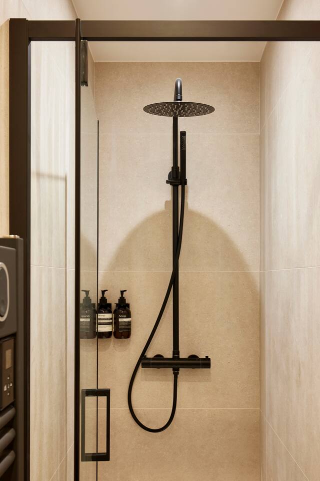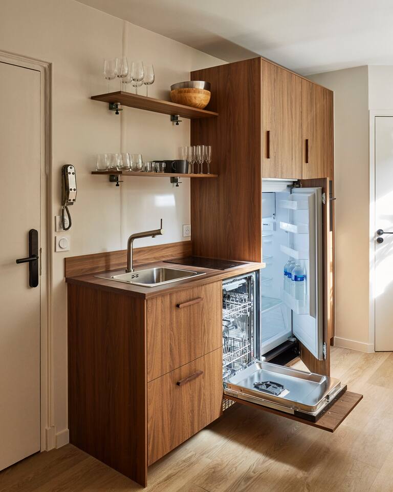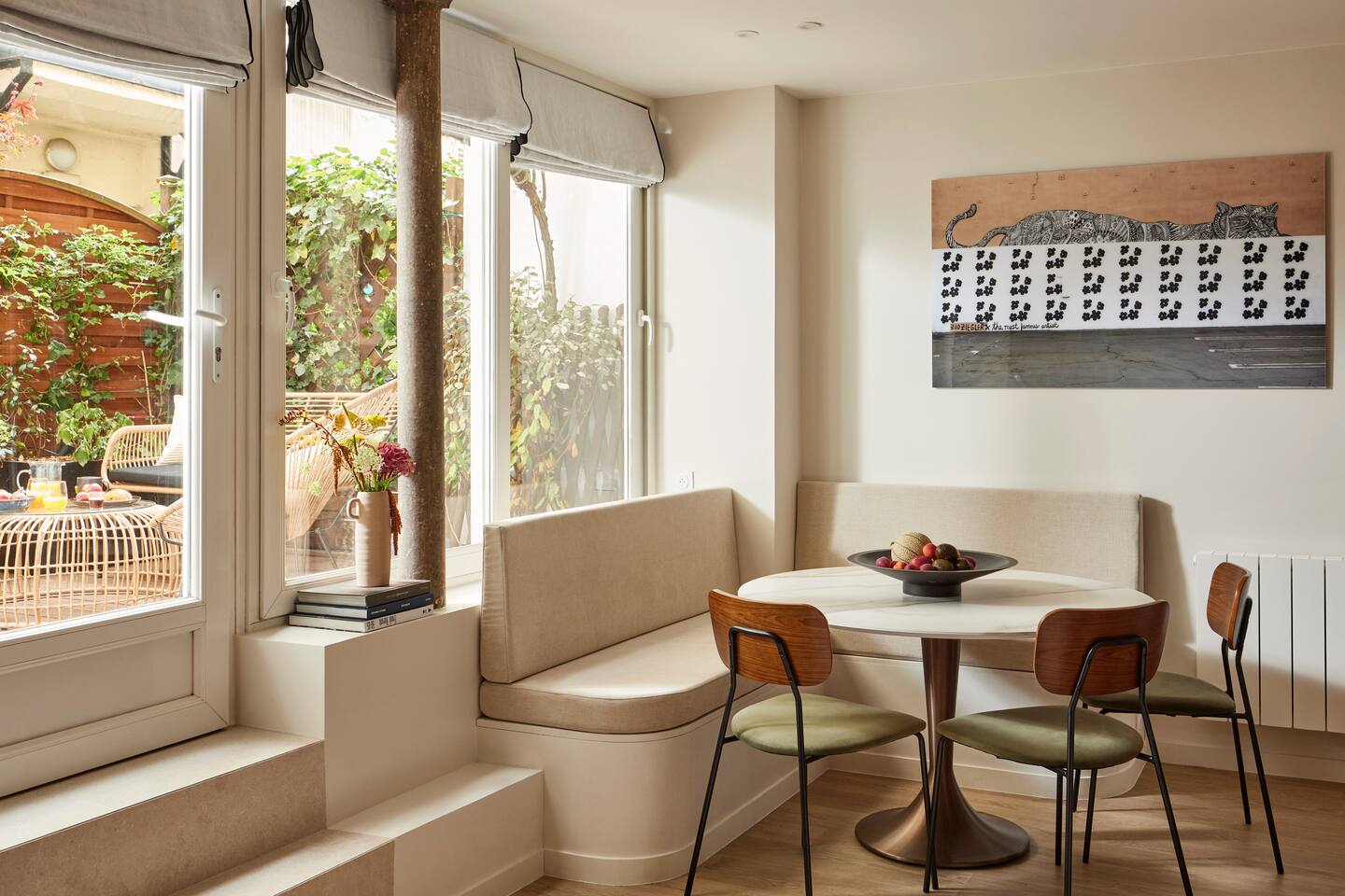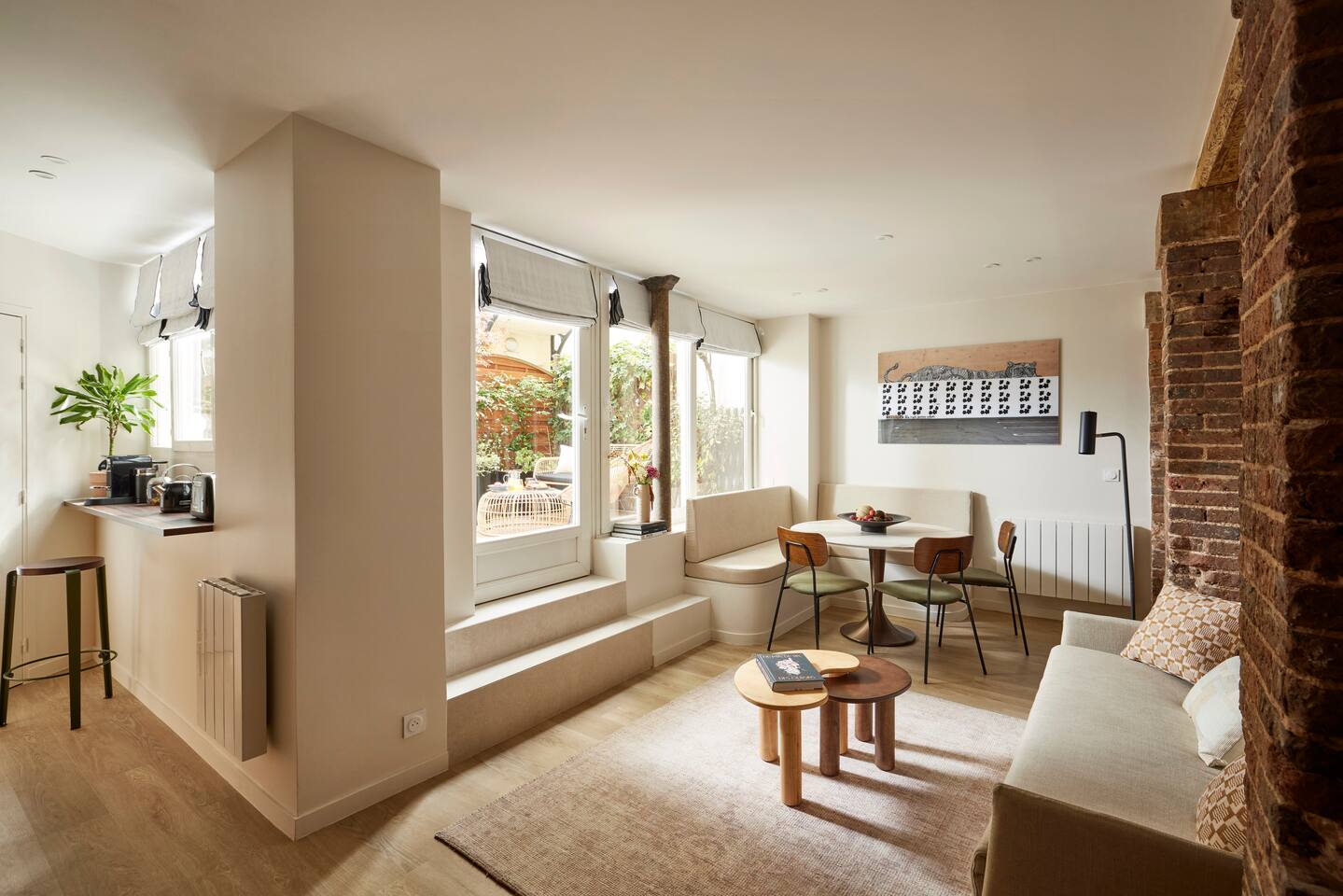 Nestled in a gorgeous building, our 55 sqm (600 sqf) apartment combines vintage charm with modern luxury on the ground floor. Situated in the vibrant Marais district, the apartment is very quiet and benefits from a sunny private terrace, to live like a local in Paris! ☆ 24/7 Easy Access: check in on your own terms with our electronic door lock. We'll provide the code before you arrive, so you can settle in at your convenience. ☆ Expertly designed space: crafted with love and attention, our apartment is both functional and aesthetic. ☆ Sleep on a luxury "hotel quality" mattress: two spacious bedrooms each feature a queen-size bed, ample wardrobe space, and individual bathrooms. For extra guests, the living room boasts a very comfortable double convertible sofa (140x200x12cm), with linens conveniently tucked away in the master bedroom wardrobe. ☆ Dine & unwind: whether you're hosting a dinner or enjoying a quick meal, the dining area features a stylish marble table for six. ☆ Gourmet kitchen: our well-appointed kitchen is equipped with top-of-the-line appliances including a dishwasher, combination oven/microwave, induction hob, kettle, and a special Nespresso machine that also crafts lattes (complimentary capsules). We haven't forgotten the toaster, crockery, utensils, or the essential washer/dryer. ☆ Splendid bathrooms: Each bedroom has its own en-suite bathroom, equipped with a shower and a vanity unit. You will find complimentary hand, body, and hair products, and fluffy towels for all guests. One toilet is located in one of the bathrooms, and the other is near the kitchen. ☆ Stay connected: whether you're here for work or leisure, our ultra-high-speed internet ensures you're always online, in every corner of the apartment.